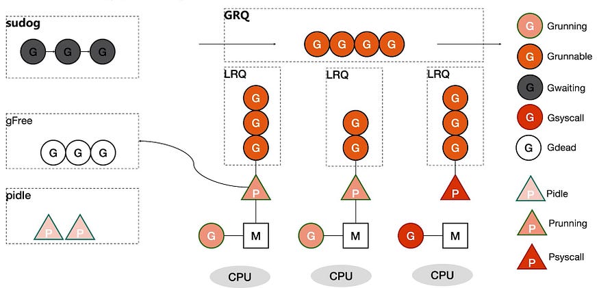 | GRQ (Global Run Queue) | 모든 P가 공유하는 큐이다. P는 자신의 LRQ가 비게 되면 GRQ에 있는 goroutine을 자신의 LRQ에 넣는다. GRQ에는 LRQ에 속하지 않는 G들이 존재하고 G가 LRQ에 소속되지 않는 이유는 다양하다. |