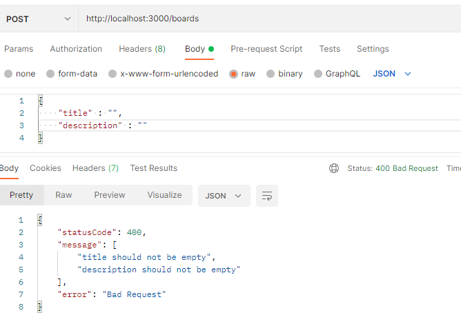 지금은 게시물을 생성할 때 제약을 주지 않아 'title'과 'description'의 내용이 아무것도 없어도 게시가 가능했다. 이 부분을 'dto'폴더의 수정을 통해 파이프를 수정해보겠다.