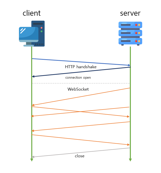 동작은 최초 통신 시 일반 HTTP request를 통해 연결을 확립하며, 그 후의 통신은 webSocket 독자의 프로토콜로 이어간다. 즉 하나의 커넥션으로 데이터 송수신이 가능하다.