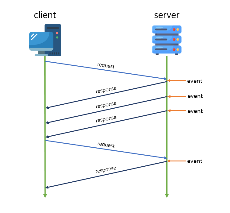 클라이언트가 request를 보내면 서버에서 이벤트를 전달할 때 해당 요청을 끊지 않고 계속해서 응답을 보내는 방식이다. 클라이언트가 서버에 다른 request를 보내고 싶다면 새로운 커넥션을 맺어야 한다.