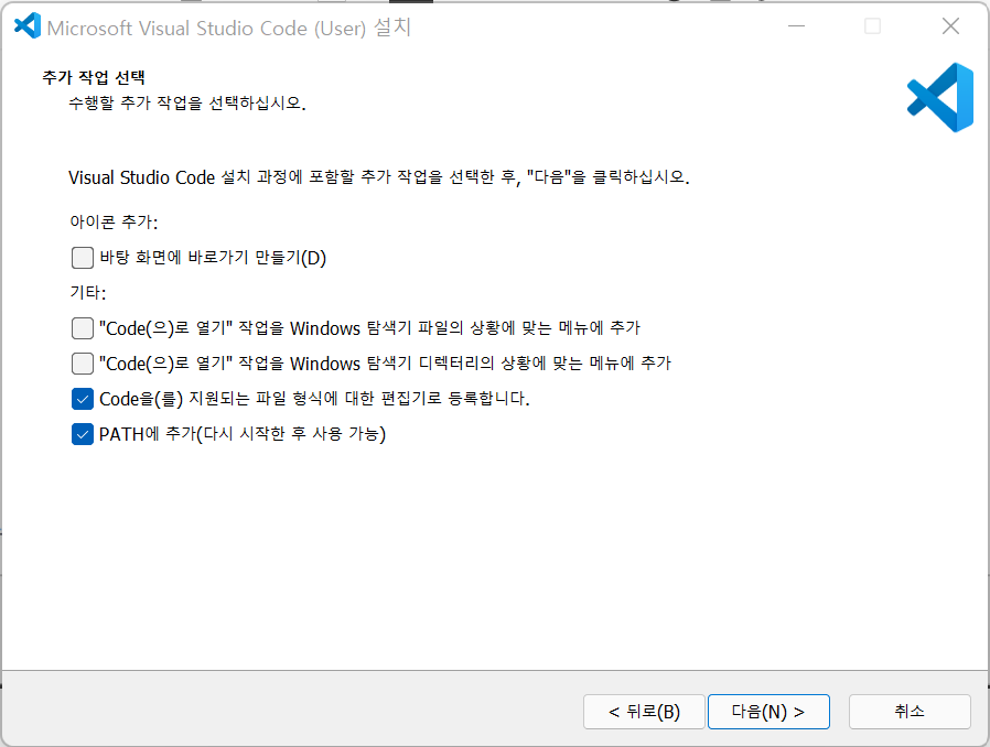 추가 작업 부분은 PATH에 추가 부분만 체크해주시면 충분할 것 같습니다.