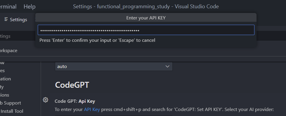 - API Key 발급이 완료되었다면 'ctrl(cmd) + shift + p'를 눌러 'CodeGPT: Set API KEY'를 입력하고 enter를 누를 다음에 이전에 발급받은 API Key 입력.
