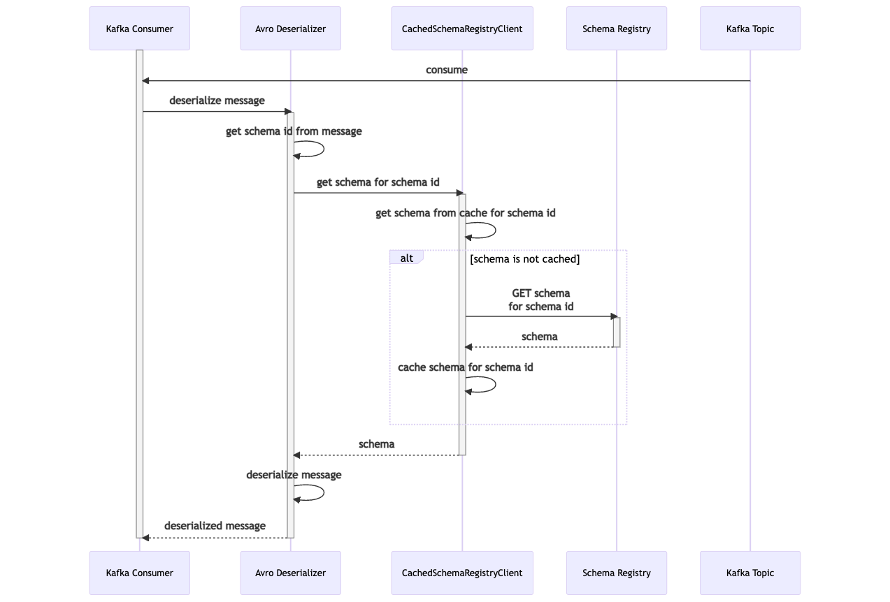 - consumer는 메시지 내의 schema id를 이용해 Schema Registry에서 Schema를 조회 후 역직렬화 수행