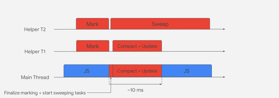 Major GC 에서는 JavaScript 실행과 보조 스레드의 작업을 동시에 이루어진다. 이 과정에서 Concurrent Marking이 진행되며, 이는 메인 스레드가 JavaScript를 실행하는 동안에 보조 스레드가 백그라운드에서 객체를 마킹하는 방식이다.