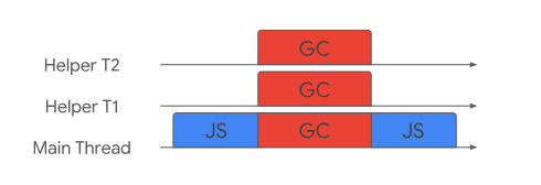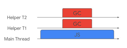 Parellel 방식에서는 메인 스레드와 보조 스레드가 동시에 작업을 수행한다. 하지만 여전히 "Stop-the-World" 방식을 사용하므로, 가비지 컬렉션 동안 JavaScript 실행이 중단된다. 그럼에도 불구하고 여러 개의 보조 스레드를 통해 작업이 나누어지기 때문에, 전체적으로 걸리는 시간을 짧아진다. V8 엔진에서는 객체를 스레드 간에 동기화하여 처리하는 방식으로 병렬 작업을 수행한다.