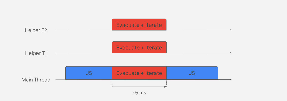 V8 엔진에서는 Parellel Scavenging 방식을 사용하여 여러 보조 스레드가 New Space를 청소하고, 살아남은 객체들을 다른 공간으로 이동시키는 작업을 한다.