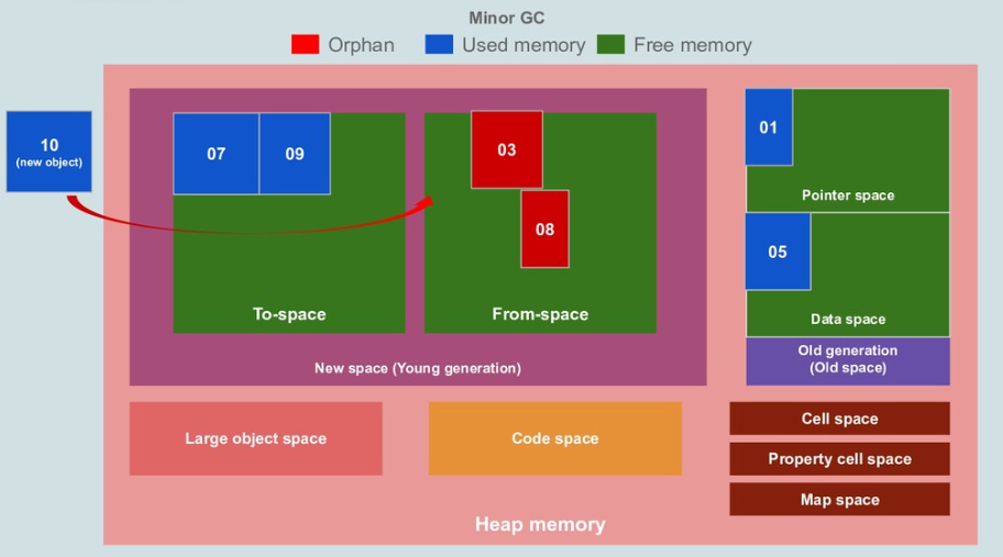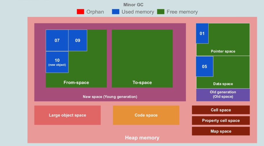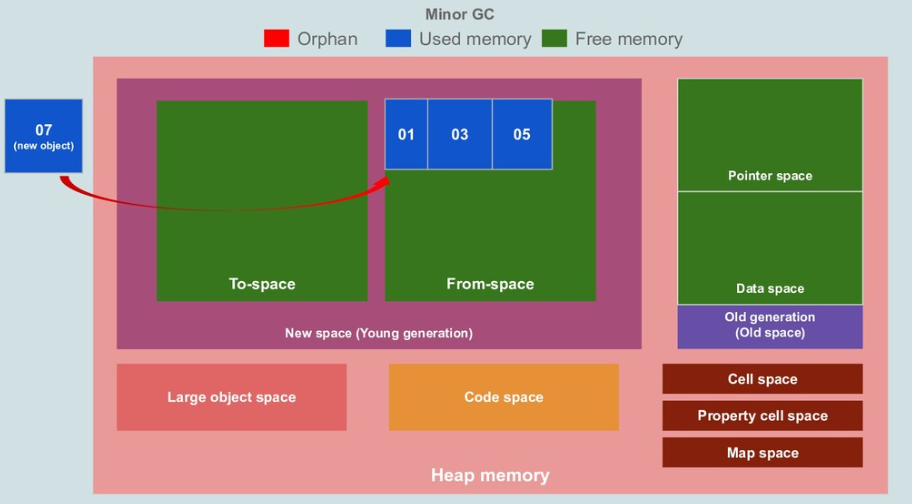 Moinor GC는 새 객체를 위한 공간을 확보하기 위해 New Space를 정리하고 압축하는 역할을 수행한다. 이 과정은 매우 빈번하게 일어나지만, V8 엔진의 최적화 덕분에 사용자에게는 거의 영향을 미치지 않는 효율적인 프로세스라고 한다.