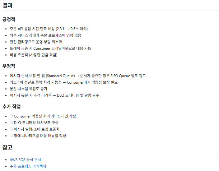 이 결정으로 인해 예상되는 영향을 솔직하게 기록한다. 긍정적인 면만 쓰면 안 된다. 트레이드오프를 명확히 인지하고 있음을 보여줘야 한다.