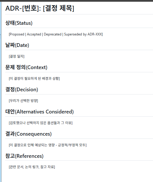 - 템플릿은 어떤 항목을 포함할지(Context, Decision, Alternatives, Consequences 중 어디까지 쓸 것인가)