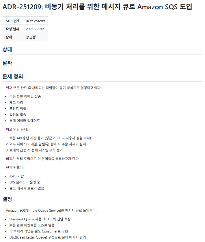 소프트웨어 아키텍처와 관련된 중요한 설계 결정을 문서화하는 방법이다. ADR의 핵심은 단순히 "무엇을 결정했는가"를 기록하는 것이 아니다. "왜 그렇게 결정했는가", "어떤 대안들이 있는가", "그 결정으로 인해 어떤 트레이드오프가 발생했는가"를 함께 남기는 것이다. 내가 생각하는 ADR은 "Why"를 정확하게 기록하는 것이라 생각한다. 업무를 위한 업무는 싫다. 어떠한 상황에서 어떤 결정을 "왜" 했는지를 간단명료하게 기록하는 것이라 생각한다.