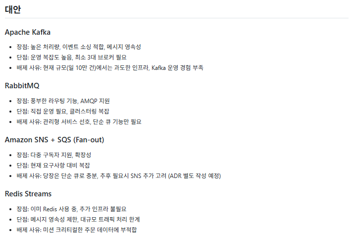 검토했으나 선택하지 않은 옵션들을 기록한다. 이 섹션이 있어야 "왜 다른 방식은 안 되는 거죠?"라는 질문에 답할 수 있다.